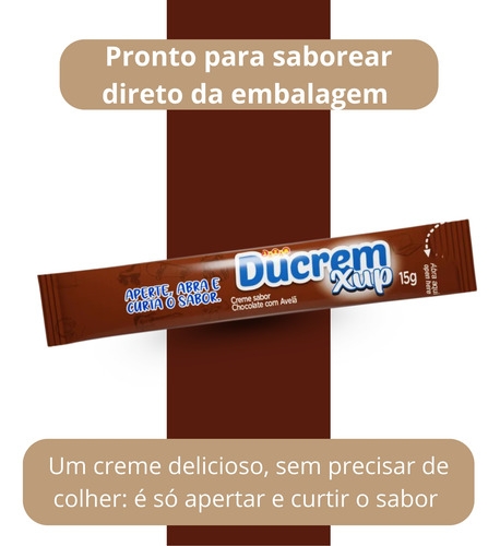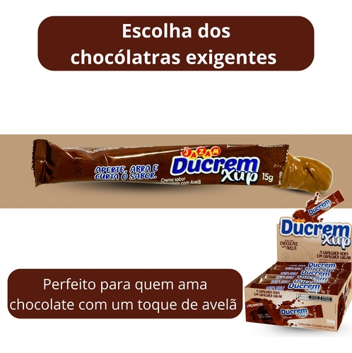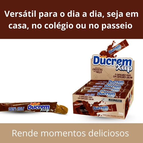 Ducrem Xup creme de avelã chocolate, sobremesa pronta individual, bisnaga Ducrem Xup 15g, display Ducrem Xup 50 unidades, doces lembrancinhas festa infantil, sobremesa cremosa chocolate avelã, lanche prático em bisnaga de creme, Ducrem Jazam doce individual, doces para festas e eventos, guloseimas portáteis chocolate e avelã