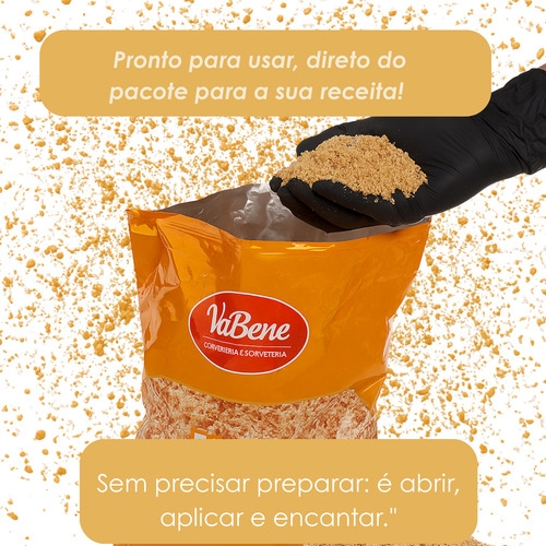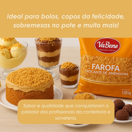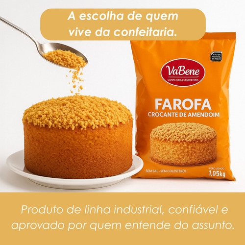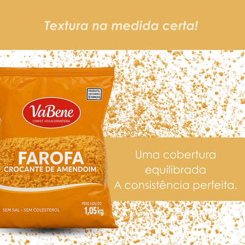 Farofa crocante, sem sal, sem colesterol e com textura irresistível: a Farofa de Amendoim VaBene é ideal para decorar, rechear e finalizar receitas doces. Pronta para uso, valoriza sobremesas com crocância leve, visual artesanal e excelente rendimento.