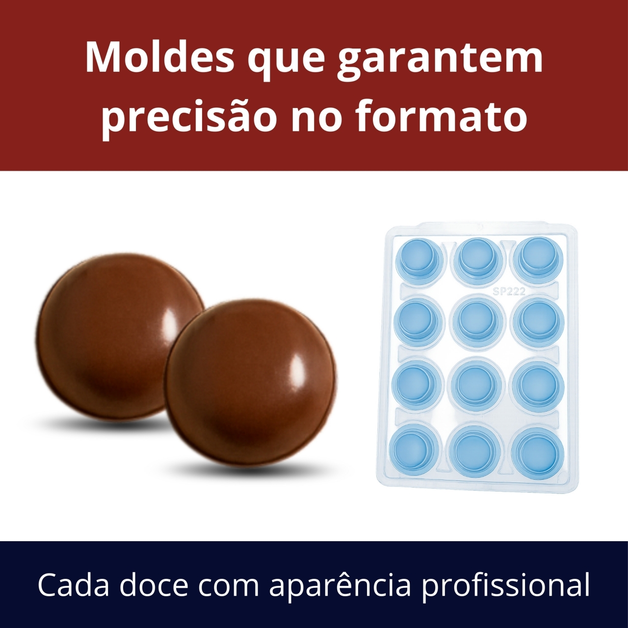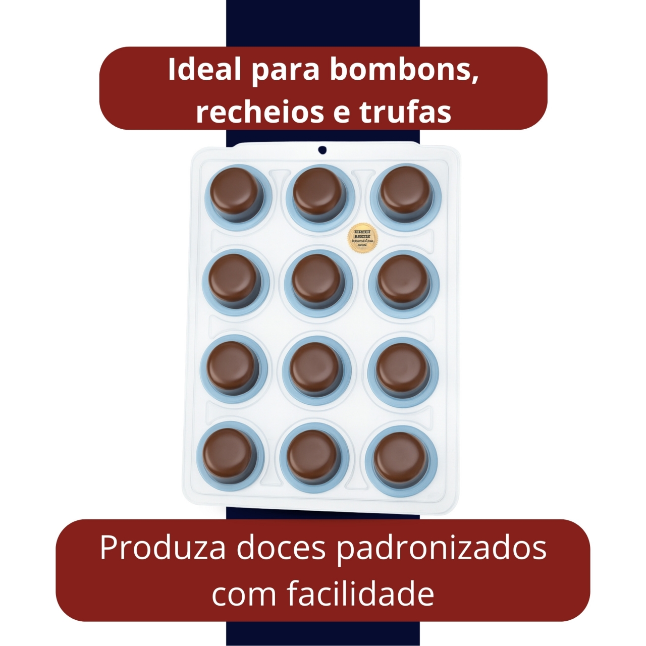 Produto de forma especial composto por acetato rígido e silicone flexível para facilitar a produção de mini pães de mel, trufas e chocolates com acabamento profissional.